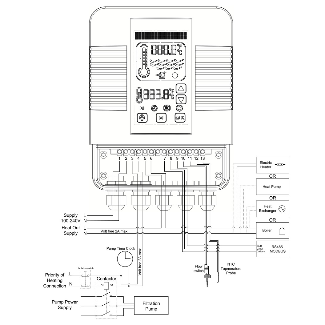 Цифровий контролер Elecro Heatsmart Plus для управління теплообмінниками. Heatsmart Plus обладнаний сенсорним дисплеєм, що дозволяє керувати усіма опціями обігріву вашого басейну одним натисканням. Пристрій сумісний з BMS (Building Management System) Ready для обміну даними. Система пріоритету дозволяє оптимізувати витрати енергії для підтримки ідеальної температури басейну (розумне управління циркуляційним насосом та фільтрацією). Рекомендовано для теплообмінників Elecro серій G2/SST. Може використовуватись з електронагрівачами, тепловими насосами, котлами. Постачається з датчиком протоку та температури.
