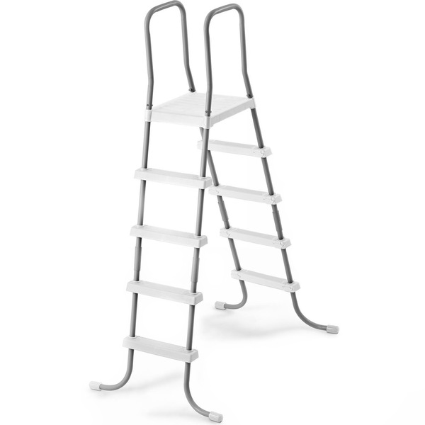 Металева драбина 58337. Допоможе зі зручністю входити в басейн і виходити з нього. Оснащена майданчиком. Основа виготовлена з якісного металу з антикорозійним напиленням. Сходи та майданчик — міцний пластик із захистом від УФ. Розбірна конструкція зручна для перевезення. Підходить до будь-яких наземних басейнів висотою до 132 см.