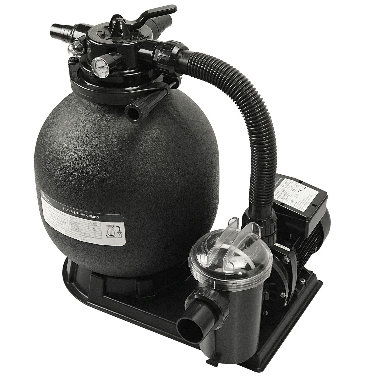 Система комплектується 4-режимним клапаном управління фільтрацією, манометром, сполучними муфтами і настановною платформою.