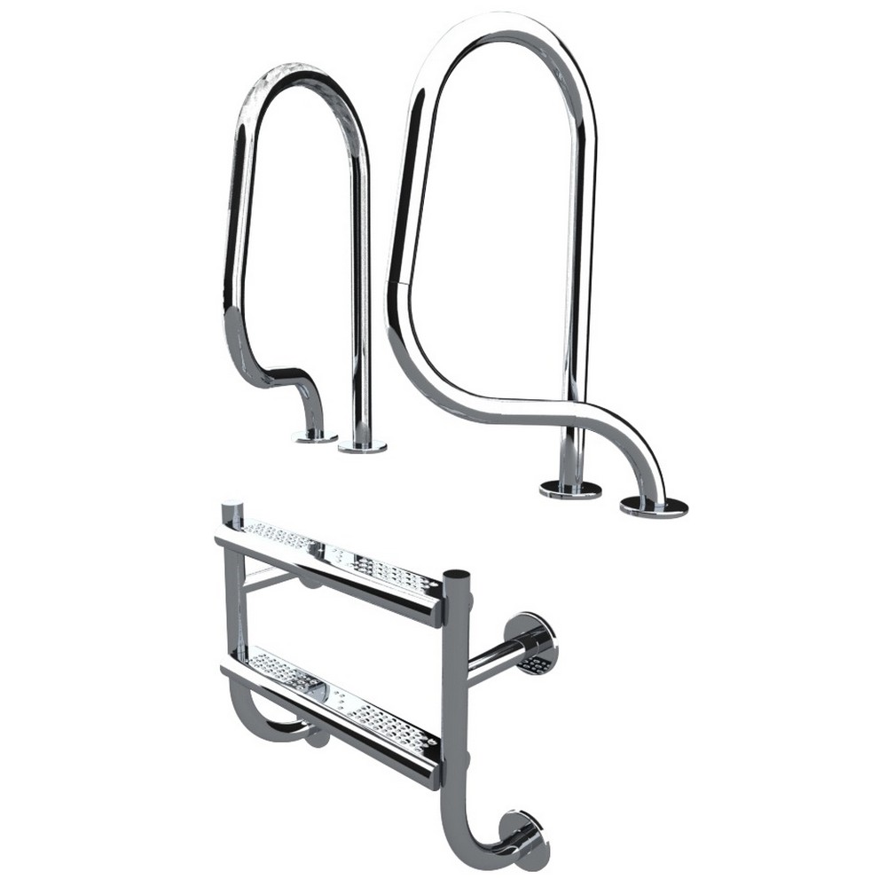 Такі сходи підійдуть для настінного монтажу в будь-якому басейні. Поручні встановлюються у борт басейну за рахунок з’єднання фланців. Друга секція сходів встановлюється на стіну басейну. Обидві частини сходів виготовляються із нержавіючої сталі.