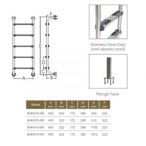 Сходи Emaux BHK515-SR для зручного і безпечного спуску в басейн. Нижня частина сходів без верхніх поручнів використовується в заглиблених басейнах, де немає можливості встановити цільні сходи стандартного типу. Виготовлена з полірованої нержавіючої сталі марки AISI-304. Сходи кріпляться до стіни за допомогою допоміжного кріплення з болтами. Нижня частина сходів впирається в стіну басейну прогумованою заглушкою. Сходинки кріпляться до поручнів за допомогою болтів. Може використовуватися окремо, проте оптимальніше всього використовувати в поєднанні з поручнями типу ARV, ARB, ARC.
