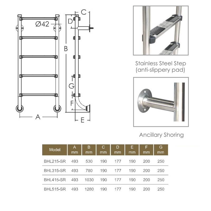 Сходи (нижня частина, без поручнів) Emaux BHL515-SR для зручного і безпечного спуску в басейн. Виготовлені з полірованої нержавіючої сталі марки AISI-304. Сходи кріпляться до стіни за допомогою допоміжного кріплення з болтами. Нижня частина сходів впирається в стіну басейну прогумованою заглушкою. Сходинки кріпляться до поручнів за допомогою болтів. Сходи призначені для заглиблених басейнів всіх типів. Може використовуватися окремо, проте оптимальніше всього використовувати в поєднанні з поручнями типу ARV, ARB, ARC.