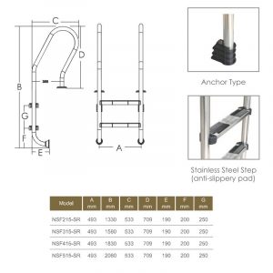 Сходи Emaux NSF515-SR призначені для зручного та безпечного спуску в басейн. Поручні і сходинки виготовлені з полірованої нержавіючої сталі марки AISI-304. Поручні кріпляться до борту за допомогою пластикових склянок (анкерів). Нижня частина сходів впирається в стіну басейну прогумованою заглушкою. Сходинки кріпляться до поручнів за допомогою болтів. Сходи призначені для заглиблених басейнів. У комплекті поставляються кріпильні елементи.
