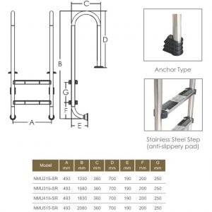 Сходи Emaux NMU415-SR призначені для зручного і безпечного спуску в басейн. Поручні та сходи виготовлені з полірованої нержавіючої сталі марки AISI 316. Поручні кріпляться до борту за допомогою пластикових стаканів (анкерів). Нижня частина сходів упирається в стіну басейну прогумованою заглушкою. Сходинки кріпляться до поручнів за допомогою болтів. Сходи призначені для повністю заглиблених басейнів з вузьким бортом. У комплекті поставляються кріпильні елементи.