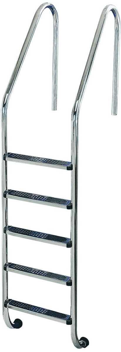 Сходи Golfinho E518.5 – це ідеальний варіант для повністю заглиблених басейнів. Сходи виготовлені з труби діаметром 43 мм. Оснащені сходинками з протиковзними пластиковими накладками. Завдяки гумовим заглушкам, елементи кріплення не порушують гідроізоляцію чаші басейну. Виконані з нержавіючої сталі марки AISI 316, стійкої до корозії, впливу ультрафіолету та хімічних реагентів. Кріпильні елементи постачаються в комплекті.